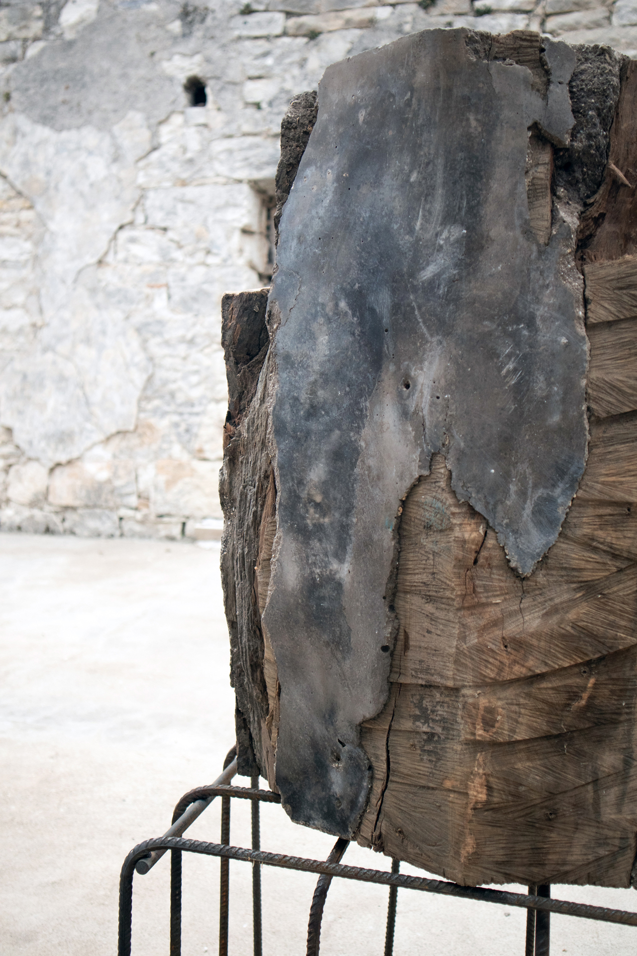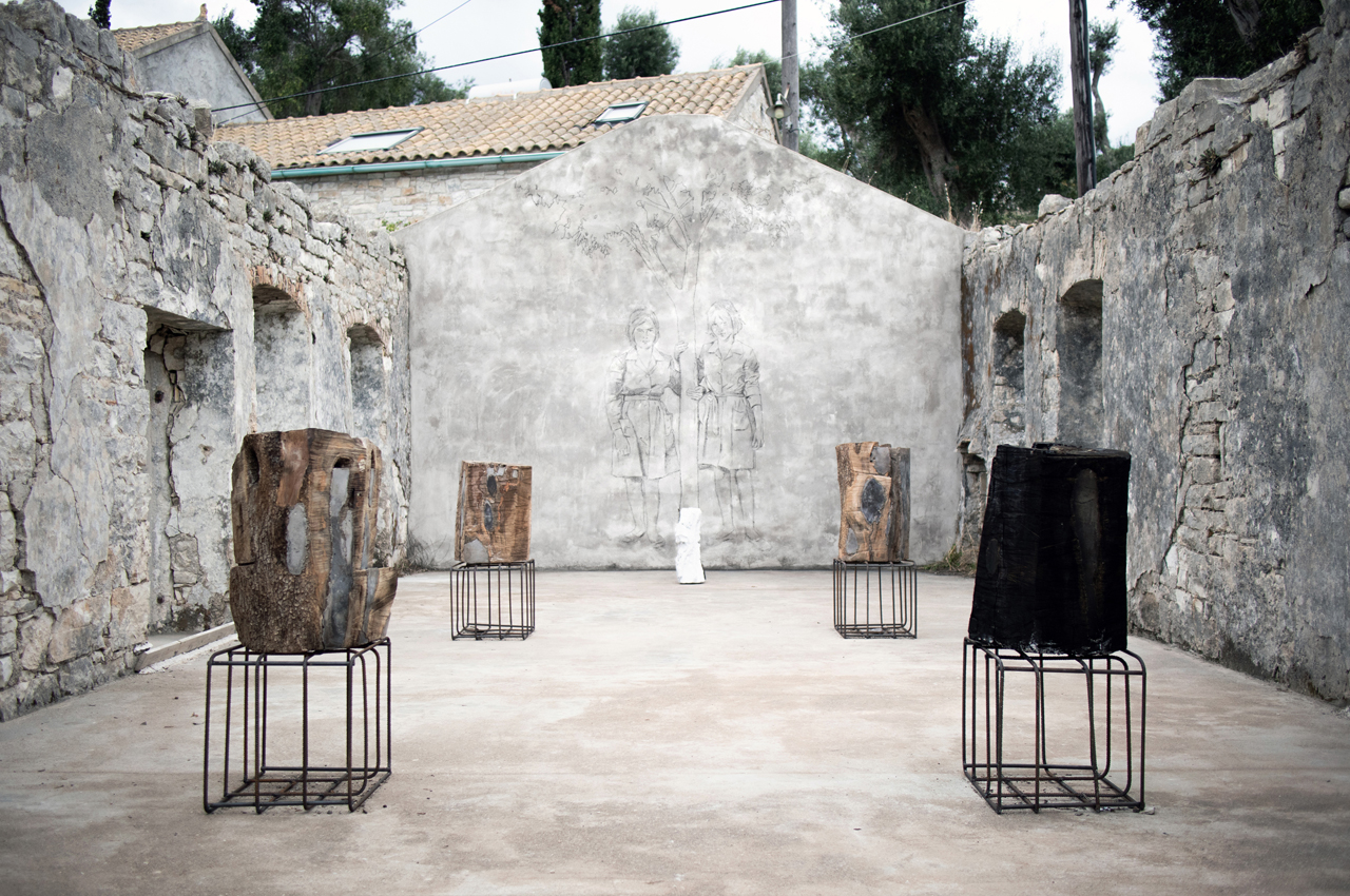 The installation A Tale of Becoming Dust for Paxos Biennale 2024 explores themes of growth and decay. Set in the ruin of Kagatika, processed olive tree trunks filled with concrete rest on pedestals of construction reinforcement and are partially burned, evoking tension between nature and human intervention while reflecting the irreversible impact of human actions.