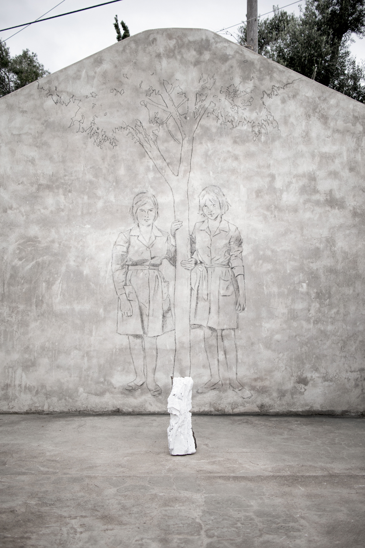 A charcoal mural, based on a 1960s photograph, depicts two young Paxiot women standing beside a tree, each holding it with one hand—a gesture open to interpretation as both protective and an attempt to hold onto something fleeting. Looking out at the viewer from the island's past, the women serve as witnesses to growth and decay, reminding us of our shared responsibility in determining the trajectory of our environment, morality and society as a whole.