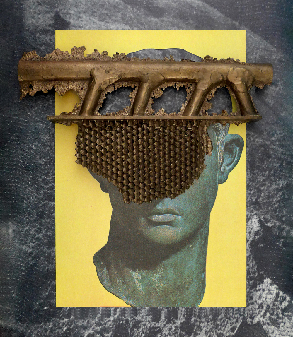 collage on paper, bronze, acrylic glas