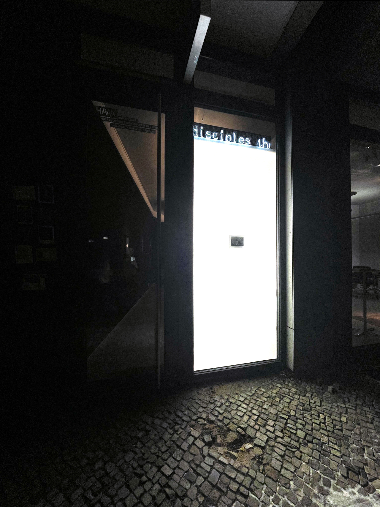 MIOSIS (2023) is a site-specific installation by the artist duo Leonid Keller at Projektor of HAWK Hildesheim. It was visible from the inside AND the outside.