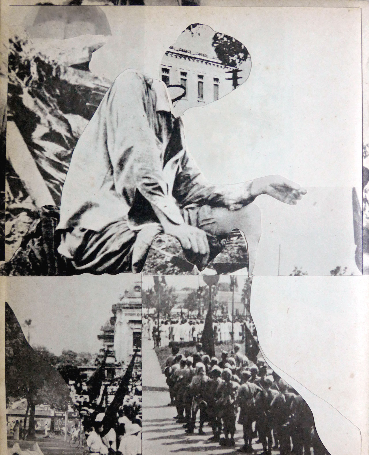 The multi-part work Red Book (2015) is based on the once widely circulated Vietnamese book DUOI LA CO VE VANG CUA DANG, which documents “the glorious days” of Ho Chi Minh’s Communist Party of Vietnam. First published in 1976, a year after the end of the Vietnam War, the book’s individual bound chapters have been transformed into separate collages. The resulting works create otherworldly, sometimes unsettling visual worlds that reinterpret the book’s propagandistic content, highlighting its fragility and constructed nature.