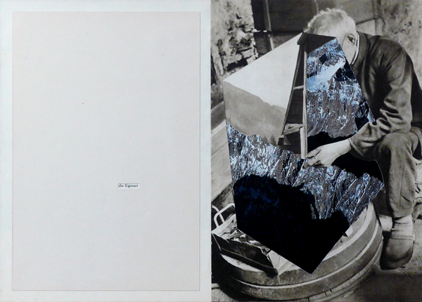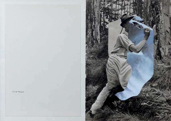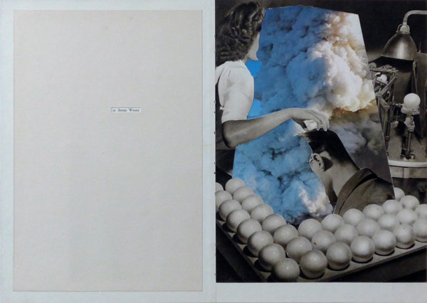 The complex collages in Gebt uns Gedankenfreiheit (Give Us Freedom of Thought) alter the content of a 1952 book on Austria's glorified craftsmanship. Spreads of collaged imagery and reduced text alter the original narrative to poetry detached from its original propagandistic intent.
