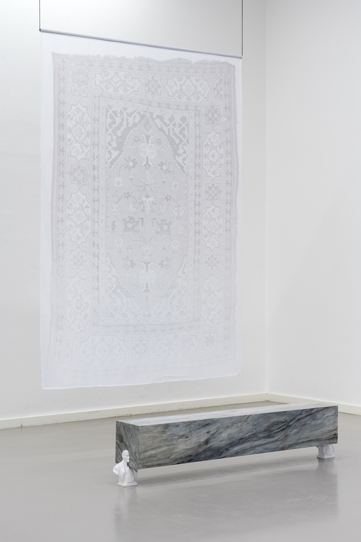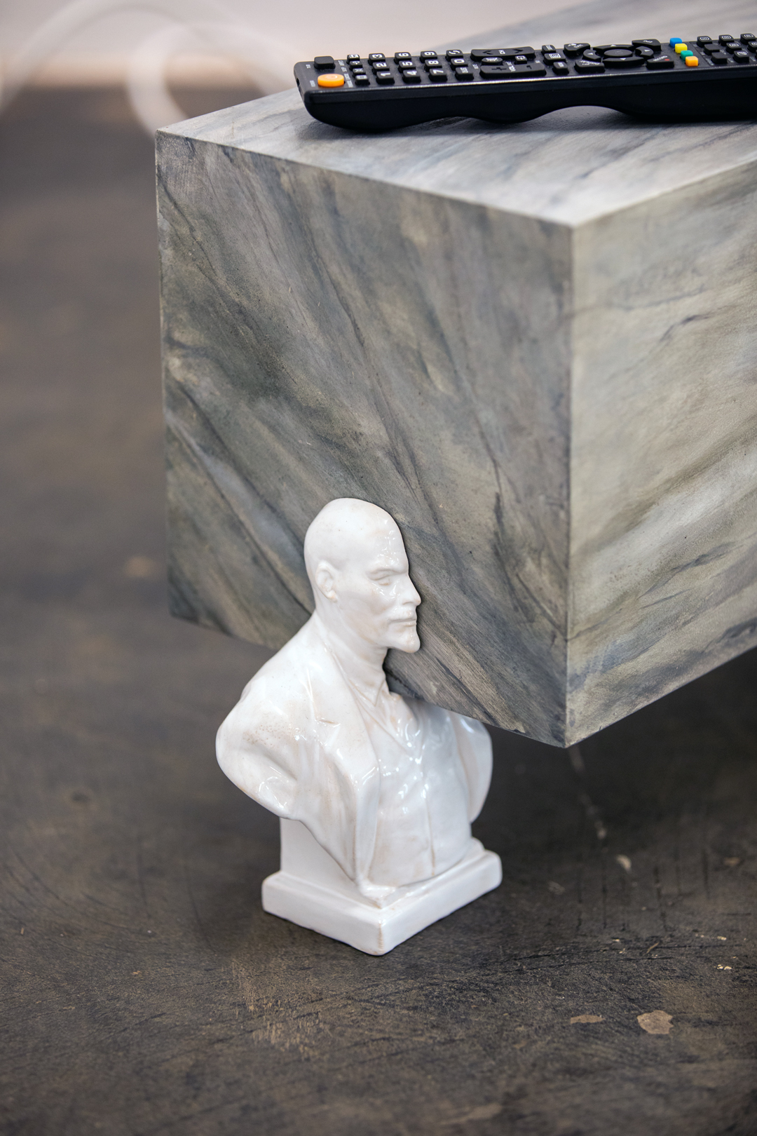 Here, a faded tapestry-reproduction on fabric, a trompe-l'œil marble pedestal painted on wood, and Lenin busts supporting the pedestal evoke Soviet aesthetics. This fictional constellation dissolves historical constraints, condensing memories of Soviet life into an imaginary interior space.