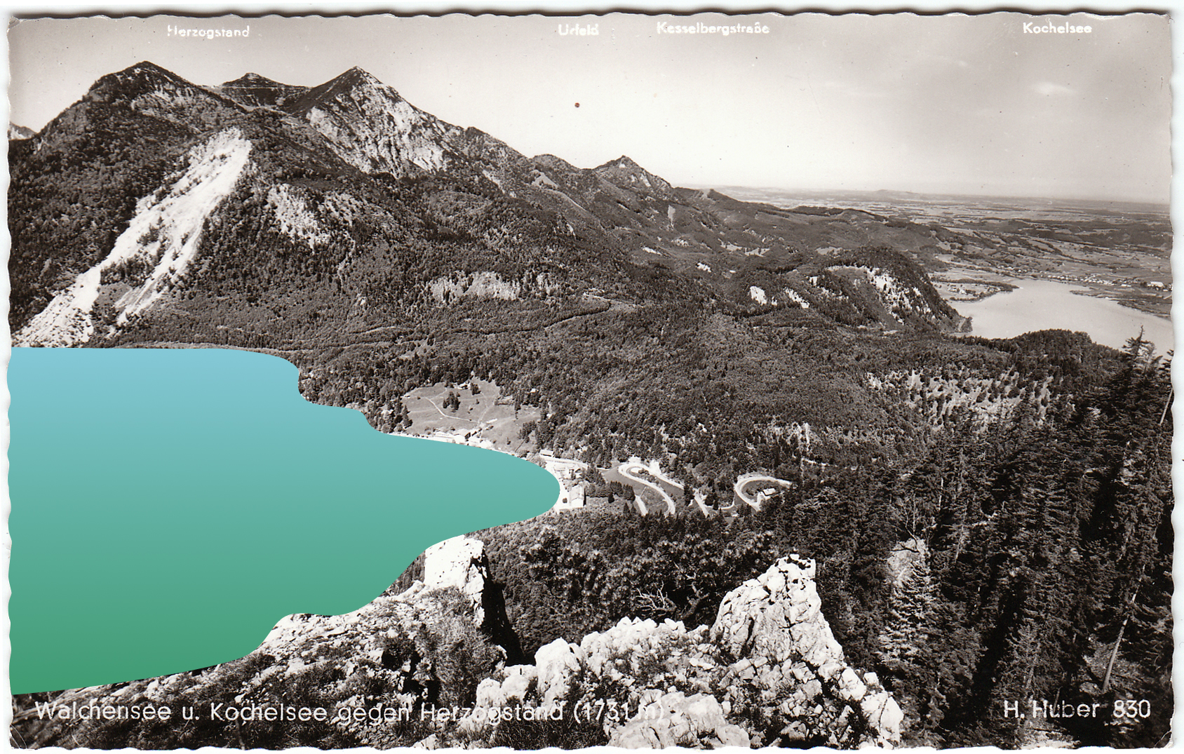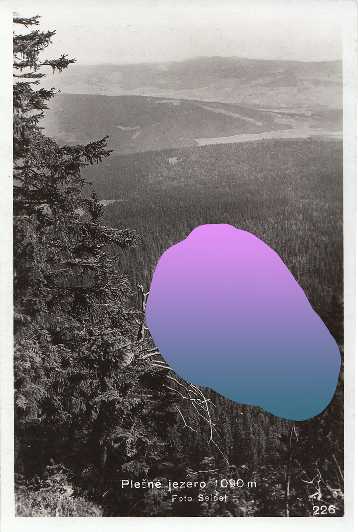 The multi-part work #shapeofalake (2016) explores the reproduction and perception of color gradients in landscapes while referencing the emergence of a digital color culture. The work combines a steel object, shaped after a nearby lake and coated in flip-flop automotive paint, with sixteen historical black-and-white postcards, over whose organic forms digitally exaggerated color gradients are applied; it shows different modes of landscape representation and reflects on the blurring between natural and digitally mediated perception.