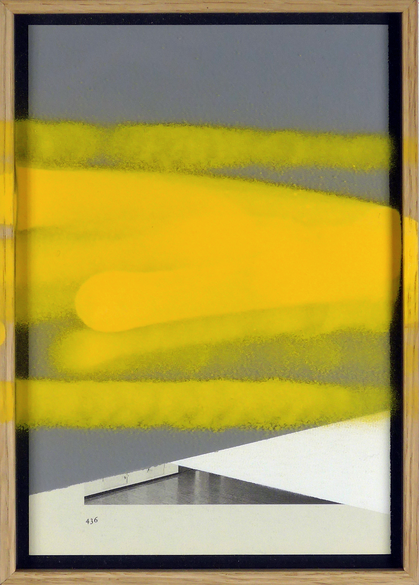 Vierzig-fünfzig (2017) examines the visual documentation of the RAF members' 1977 deaths at Stuttgart-Stammheim prison. Working from archival photographs reproduced in Stefan Aust's Der Baader Meinhof Komplex, the work isolates details by covering most of the pages with spray paint. By emphasizing form, texture, and gesture over narrative context, the work interrogates how these photographs—repeatedly re-interpreted in journalism and contemporary art—function as both evidentiary objects and sites of ongoing cultural re-inscription.